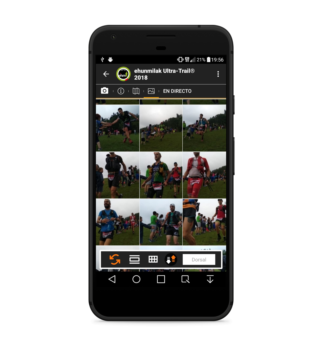 Todas las fotografías y vídeos que se toman durante la carrera van apareciendo en la galeria. Hay disponible dos modos de visualización: