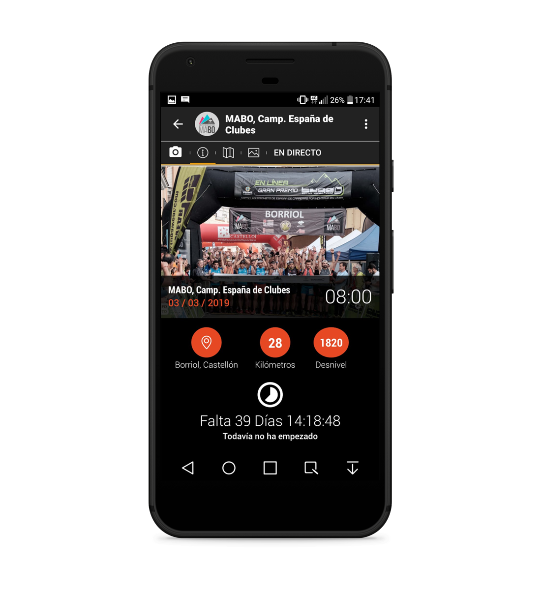 La aplicación, cuenta con un apartado para consultar la información de la carrera: hora de salida, kilometros, desnivel, lugar de meta y salida,... y muestra un mapa de satelite online, para navegar, con el track de la carrera y la ubicación exacta. Con el track de carrera en el móvil y la ubicación puedes navegar través del mapa y conocer en que punto de carrera te encuentras.